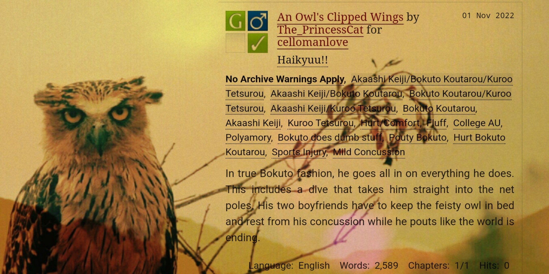 Fluff 896 Smut 741 Angst 734 Reader-Insert 629 Romance 537 Alternate Universe - Modern Setting 517 Slow Burn 483 Eventual Smut 410 Fluff and Angst 387 Oral Sex 364 Other tags to exclude More Options Crossovers. One where nothing goes right not even once. Looking for information on the anime Haikyuu.